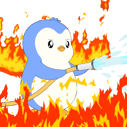 a cartoon penguin is surrounded by flames with water coming out of its mouth