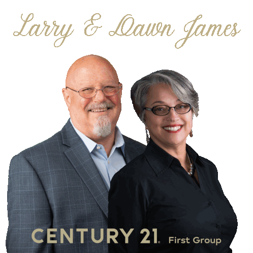 a man and a woman standing next to each other in front of a century 21 sign