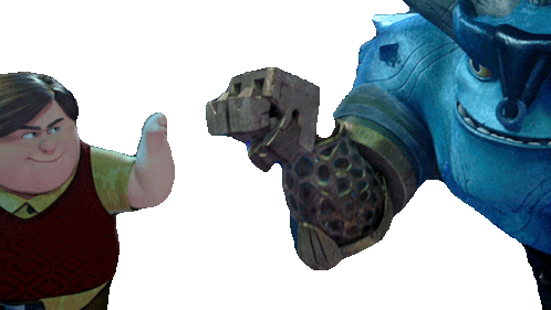 Toby Domzalski and Draal from Trollhunters share a friendly fist bump, celebrating a good job or agreement.