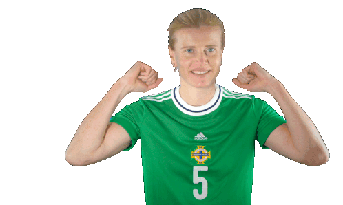 Julie Nelson, a Northern Ireland footballer, smiles and celebrates with a double fist pump in her green jersey.