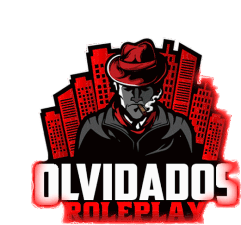 A striking logo for Olvidados Roleplay, featuring a man in a fedora smoking, set against a city skyline with a red glow.