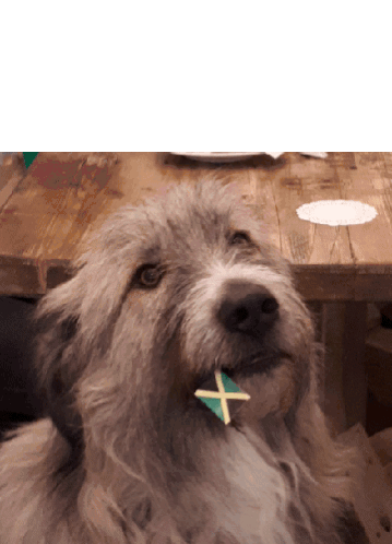 Kratu, the shaggy dog, proudly holds a small Jamaican flag in its mouth, looking directly at the camera.
