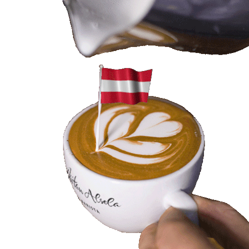 A barista pours milk into a coffee cup with Dritan Alsela branding, featuring heart latte art and a small Austrian flag.