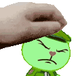 a person is petting a green cartoon character on the head .