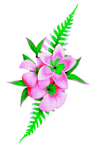 Vibrant pink flowers with lush green leaves and fern accents, creating a beautiful floral arrangement.