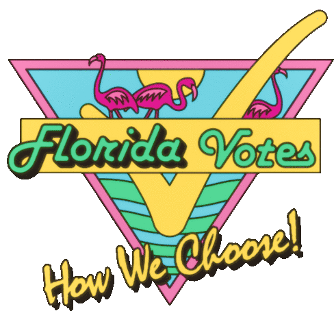 A vibrant retro-style sticker for "Florida Votes How We Choose!", featuring flamingos, a sun, and a checkmark.