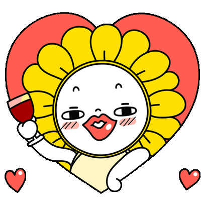 A cute cartoon sunflower character holds a glass of wine, winking playfully inside a large red heart with smaller hearts.