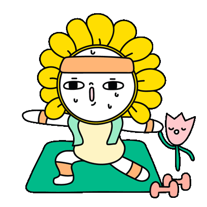 A cute Flower Sunflower character in a headband sweats while doing a yoga warrior pose on a mat.