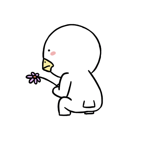 A cute, blushing duck-like character squatting and holding a purple flower, expressing blissful shyness.