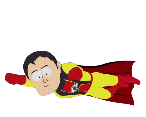 Jack Brolin as Captain Hindsight from South Park flies through the air in a classic superhero pose, ready for action.