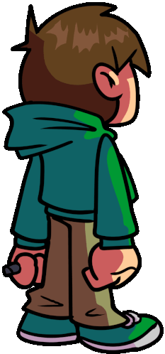 Edd from FNF Challenge and Eddsworld looks over his shoulder at Tom with a bored expression at the end of a song.