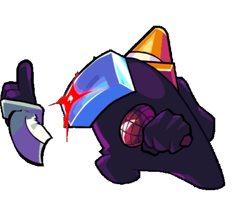 FNF Vs Impostor's D'Lowing character, a purple Among Us impostor with a cone hat, animated with a microphone and sharp weapon.