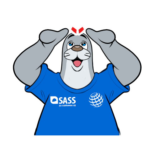 Cartoon seal, Foca Na Segurança Sass Pepsico, forms a heart with its arms, wearing a blue SASS shirt.
