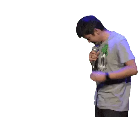 a man wearing a gray shirt with a skull on it stands in front of a microphone