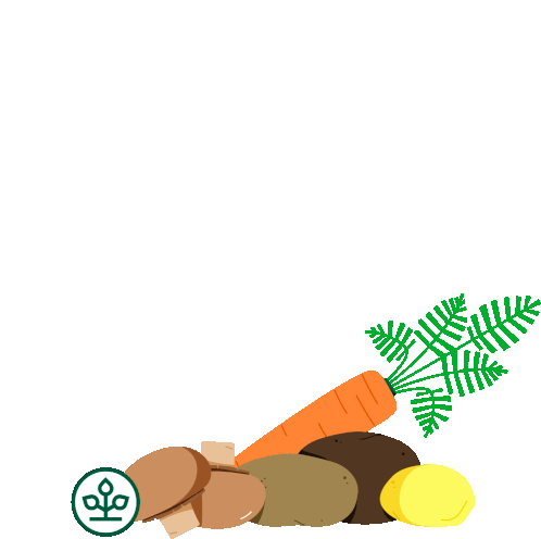 Animated sticker promoting healthy eating with fresh vegetables like carrots, potatoes, and mushrooms, encouraging a good feeling.