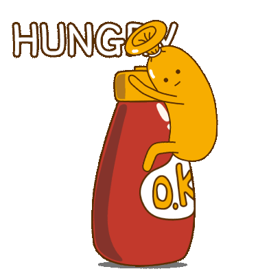 A hungry cartoon sausage character hugs a ketchup bottle, winking as a red heart appears, with 'HUNGRY' text.