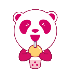 The cheerful Foodpanda panda mascot happily sips a refreshing bubble tea with a straw, enjoying its sweet treat.