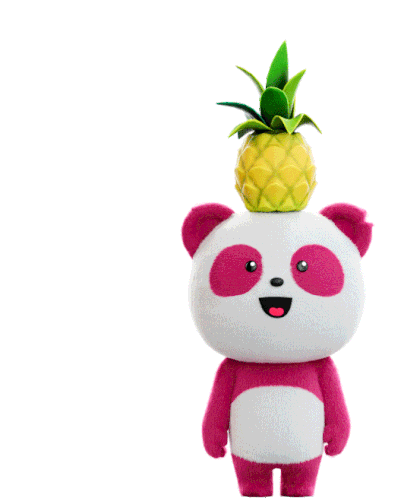 Animated Foodpanda mascot, a cute pink and white panda, balances a pineapple on its head and smiles happily.