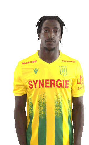 Bamba, a football player for FC Nantes, celebrates a goal with a distinctive hand gesture, wearing his yellow and green striped jersey.