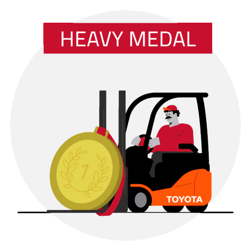 A Toyota forklift driven by a man, proudly carrying a large gold medal, symbolizing a 'Heavy Medal' achievement.