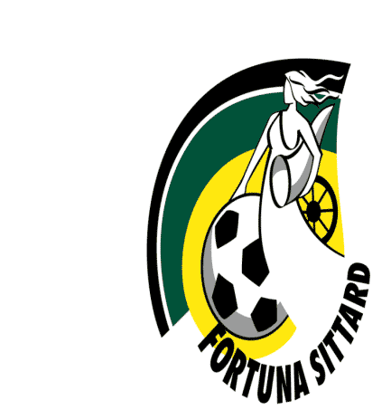 Fortuna Sittard football club logo featuring a stylized woman holding a soccer ball, set against a green and yellow background.