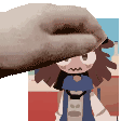 a hand is holding a cartoon character 's head in front of a picture .