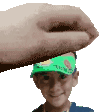 A gentle hand affectionately strokes the head of a small child wearing a green hat, featuring Fran in this heartwarming sticker.