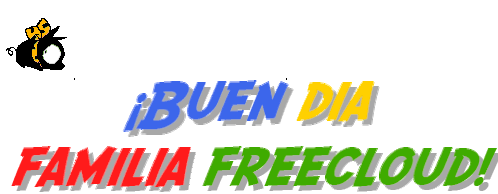Animated sticker wishing 'Good Day Freecloud Family' in Spanish, featuring a small, quirky animated character.