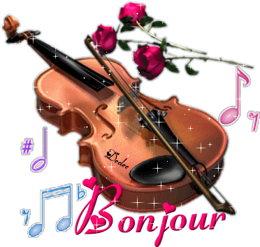 A sparkling animated sticker featuring a violin adorned with red roses, musical notes, and the greeting 'Bonjour'.