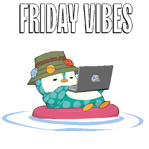 A blue and white penguin in a fishing hat works on a laptop while floating on a pink ring, embodying the 'FRIDAY VIBES' of relaxation and productivity.