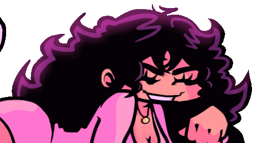 A cartoon character from Friday Night Funkin' with long purple hair and a pink top smiles mischievously.