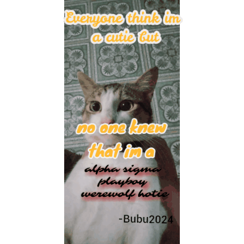 Bubu the cat, looking adorable, reveals its true identity as an 'alpha sigma playboy werewolf hottie' in a funny caption.