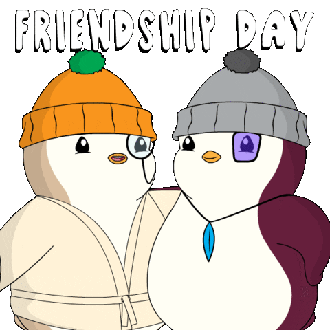 Two adorable Pudgy Penguins celebrate Friendship Day, standing close with one arm around the other. A sweet depiction of best friends.