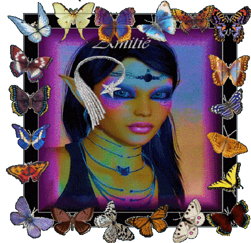 An animated sticker featuring a frame of colorful butterflies surrounding various central images like a fairy, a rose, and hands.
