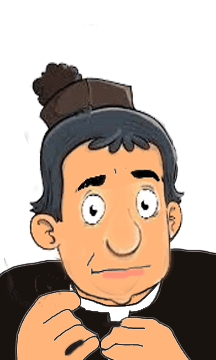 Animated sticker of Don Bosco, a cartoon priest, transitioning from a frightened expression to a nervous smile with sweat drops.