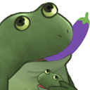 A green frog shakes while holding a purple eggplant in its mouth and cradling a smaller frog in its hands.