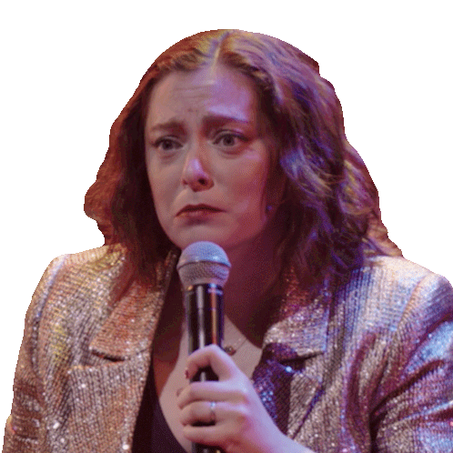 Rachel Bloom holds a microphone, making a sad and frowning face, wearing a sparkly jacket.