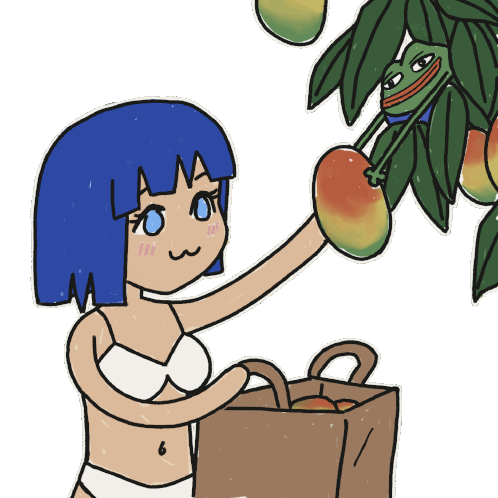 Blue-haired anime girl and froggo are best friends, collecting ripe mangoes from a tree into a bag, enjoying summer fun.
