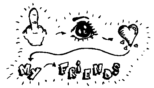 Renforshort's 'Fuck I Love My Friends' sticker, a black and white animation depicting a middle finger, eye, heart, and 'MY FRIENDS' text.