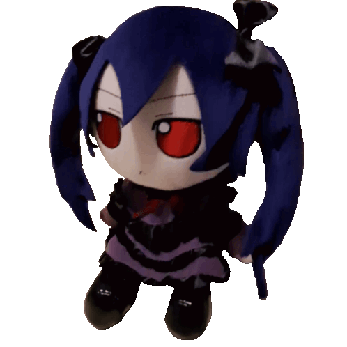 A cute Fumo Fumofumo Himawari doll with blue twintails and a purple dress gently bounces, vibing playfully.