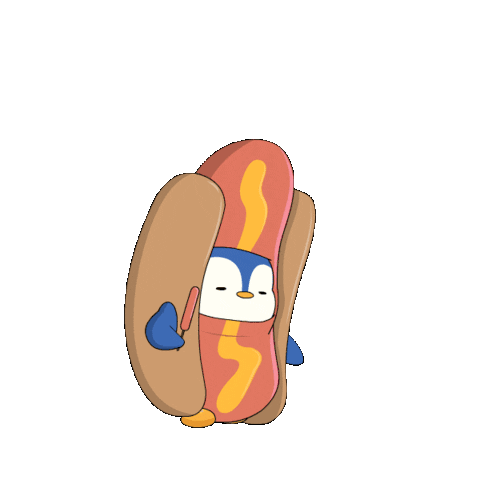 A cute and funny cartoon penguin character from Pudgy Penguins dressed in a hot dog costume with mustard, holding a small stick.