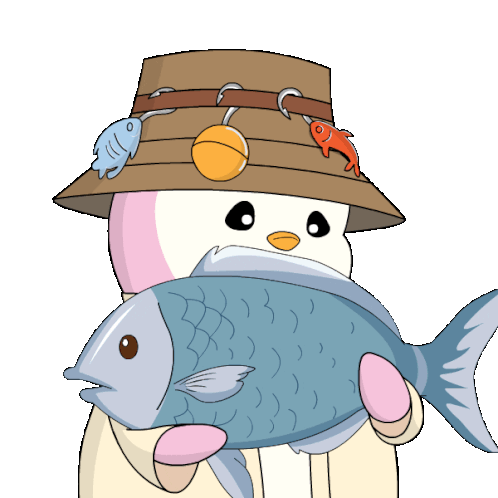 A cute Pudgy Penguin, wearing a fishing hat adorned with lures, holds a large, freshly caught fish with a slightly sad expression.