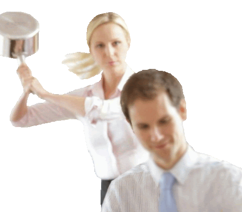 a woman in a pink shirt is holding a pot over a man 's head
