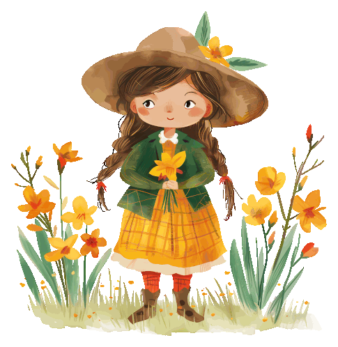 a little girl in a plaid dress and hat is holding a bouquet of yellow flowers