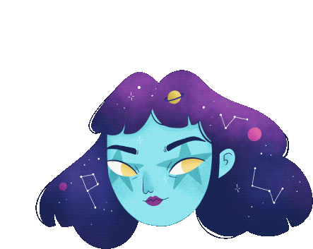 An animated cosmic girl's face with blue skin, purple galaxy hair, and twinkling stars. Her eyes blink and she gives a subtle wink.