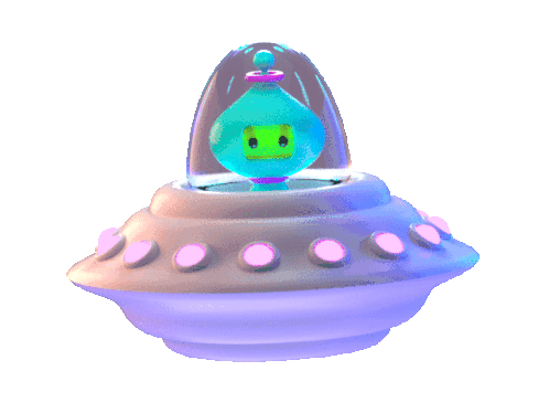 A cute green-faced alien character pilots a purple and blue UFO spaceship through outer space.