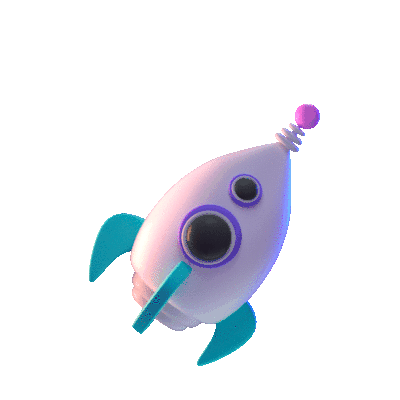 A sleek, stylized 3D rocket with purple, white, and teal colors gracefully flies through outer space.