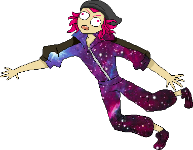 An animated pixel art sticker featuring a character with vibrant pink hair against a swirling galaxy space background, possibly Kaito Momota or Kazuichi Souda.