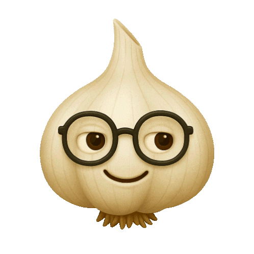 a cartoon illustration of a garlic bulb wearing glasses and smiling