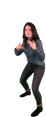A woman in a blue shirt and jeans moves her hands as if smelling something delightful, possibly in a garden setting.